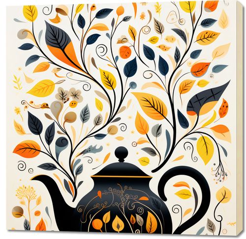 Obraz z serii wnętrza zatytułowany Jesienna Melodia. Czarny dzbanek do herbaty, zdobiony subtelnymi złotymi i pomarańczowymi wzorami, z którego wyrastają kolorowe liście i kwiaty, przypominające jesienny ogród pełen życia. Kompozycja wypełniona jest ciepłymi barwami złota, pomarańczy i brązu, które kontrastują z eleganckim czernią dzbanka. Te detale dodają obrazowi nuty elegancji i spokoju. Świetnie sprawdzi się w herbaciarniach, księgarniach jak i również w domowych salonach czy biblioteczkach.