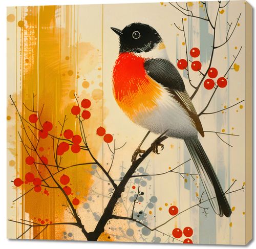 Obraz z serii abstrakcja zatytułowany Jesienny Rudzik przedstawia kolorowego ptaka, prawdopodobnie rudzika, siedzącego na gałęzi w otoczeniu jesiennych owoców i liści. Ptak jest szczegółowo narysowany z wyraźnymi kolorami, podkreślającymi jego piękno i elegancję, a jego poza jest pełna wdzięku i spokoju. Tło obrazu w ciepłych odcieniach żółci i oranżu, przypomina złotą paletę jesieni, z akcentami w postaci delikatnych kropelek i smug farby, które dodają dziełu głębi i tekstury. Całość kompozycji jest harmonijna i pełna spokoju, idealna do przestrzeni, które chcą wnieść element natury i spokojnego piękna do swojego wnętrza, takich jak salony, gabinety relaksacyjne, czy przestrzenie o tematyce przyrodniczej.