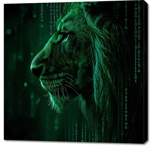 Obraz z serii pop art zatytułowany Kod Siły. Prezentuje majestatyczne oblicze lwa zanurzone w cyfrowym kodzie, który spływa w dół jak deszcz binarny, łącząc siłę i surowość natury z precyzją i logiką technologii. Zielonkawe światło podkreśla kontury i muskulaturę króla zwierząt, a cyfrowe elementy otulają jego profil, sugerując połączenie organicznego i syntetycznego świata. Ten obraz idealnie wpisuje się w nowoczesne, technologiczne przestrzenie, takie jak nowoczesne biura, pokoje gamingowe lub innowacyjne przestrzenie edukacyjne, oferując inspirację i refleksję nad współczesnym związkiem człowieka z technologią.
