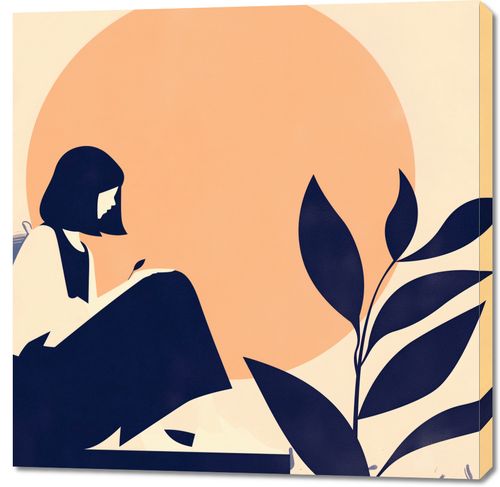 Obraz z serii minimalistyczne zatytułowany Kontemplacja. Ta delikatna grafika przedstawia sylwetkę kobiety w stanie kontemplacji na tle dużego, ciepłego, pomarańczowego słońca. Sylwetka jest otoczona przez proste, ale eleganckie czarne rośliny, co dodaje kompozycji spokojnego nastroju.Ten obraz jest idealny dla przestrzeni, które pragną wprowadzić momenty spokoju i refleksji. Będzie wspaniałym dodatkiem do sypialni, czytelni, kącików medytacyjnych czy nawet przestrzeni terapeutycznych.