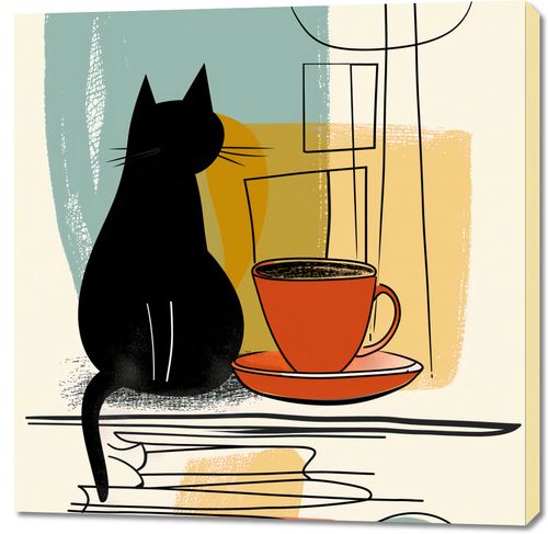 Obraz z serii abstrakcja zatytułowany Kot i Kawa. Ten pełen uroku obraz przedstawia sylwetkę czarnego kota, który wydaje się kontemplować filiżankę kawy. Stylizacja grafiki, z jej czystymi liniami i blokami kolorów w ciepłych odcieniach beżu, ochry oraz stonowanej zieleni i błękitu, tworzy atmosferę spokojnego poranka. Abstrakcyjne elementy w tle, przypominające sztukę modernistyczną, nadają plakatowi współczesnego charakteru. To dzieło sztuki idealnie pasuje do kawiarni, kuchni, a także jako subtelny akcent w nowoczesnym salonie, oferując wizualne wyrażenie komfortu i relaksu.