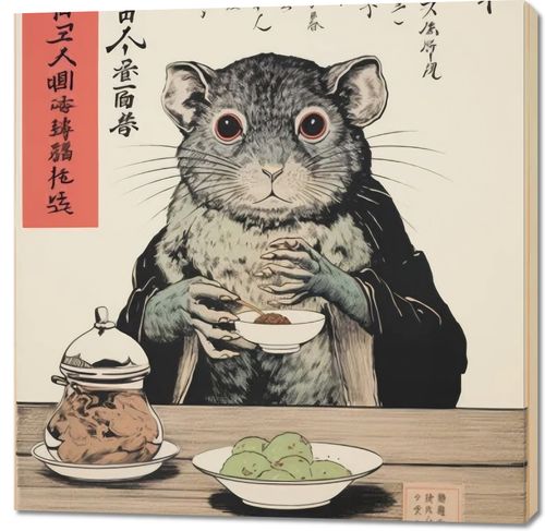 Obraz z serii motywy wschodnie zatytułowany Kulinarne Rozważania. Intrygujące spojrzenie wiewiórki, podkreślane przez wyraziste czerwone oczy i szczegółową sierść, skontrastowane z tradycyjnymi chińskimi znakami, dodającego atmosfery tajemniczości i refleksji. Na stole widzimy starannie podane potrawy, które w połączeniu z urokliwym zachowaniem postaci, tworzą obraz pełen kulturowego bogactwa. Doskonale sprawdzi się w azjatyckich restauracjach serwujących tradycyjne potrawy oraz w galeriach sztuki inspirowanej kulturą wschodu.