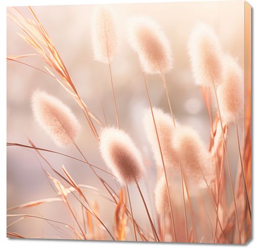 Obraz z serii natura zatytułowany Kwiaty Słońca. Na obrazie uchwycono delikatne, puszyste trawy, które delikatnie kołyszą się w ciepłym świetle zachodzącego słońca, nadając całości aura spokoju i harmonii. Pastelowa paleta barw, z dominującymi odcieniami różu i złota, przynosi uczucie łagodności i relaksu. Obraz ten będzie idealnym akcentem dla każdego wnętrza, poszukującego dodatku subtelności oraz naturalnej elegancji, szczególnie polecany jest do salonu spa, salonów kosmetycznych, poczekalni, a także jako ozdoba w domowych przestrzeniach wypoczynkowych czy sypialniach, gdzie chcemy wprowadzić elementy relaksującej natury.