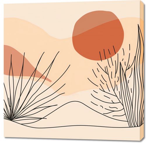 Obraz z serii boho zatytułowany Miękka Roślinność. Obraz przedstawia proste, lecz eleganckie rośliny pustynne na tle abstrakcyjnych, miękkich form i kolorów. Całość kompozycji opiera się na spokojnych odcieniach beżu, brązu oraz głębokiego terrakoty, co przywodzi na myśl ciepło i suchość pustynnego krajobrazu. Ten obraz świetnie sprawdzi się w wnętrzach o neutralnej kolorystyce, dodając im charakteru i ciepła. Idealnie nadaje się do salonu, przestrzeni wypoczynkowych lub biura, gdzie wprowadzi elementy natury i harmonii.