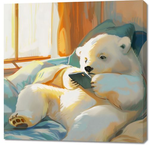 Obraz z serii abstrakcja zatytułowany Misiowe Popołudnie przedstawia uroczego, białego niedźwiadka polarnego, który odpoczywa na miękkiej pościeli, ciesząc się ciepłymi promieniami słonecznymi wpadającymi przez okno. Niedźwiedź wydaje się być zatopiony w lekturze, trzymając w łapach mały telefon, co dodaje humorystycznego i ludzkiego akcentu do sceny. Ciepła kolorystyka, od złocistych po pastelowe błękity, tworzy atmosferę spokoju i relaksu. Jasne światło i cienie na pościeli nadają głębi i tekstury, tworząc przytulne środowisko. Ten obraz doskonale wpasuje się w przestrzenie, które cenią sobie spokój i domowe ciepło, takie jak pokoje dziecięce, miejsca do czytania lub rodzinne salony.
