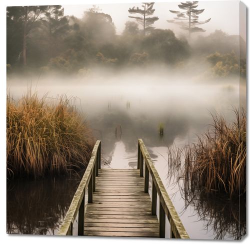 Obraz z serii pejzaże zatytułowany Most do Tajemnicy. Na tym mistycznym obrazie drewniana kładka prowadzi nas ku tajemniczej mgle, która delikatnie spowiła powierzchnię spokojnego stawu. Złote trzciny i zarysy drzew rzucają się w oczy na tle zamglonego poranka, tworząc uczucie ciepła i spokoju. Ten obraz oddaje piękno niewidzialnego świata, który czai się tuż za zasłoną mgły, zachęcając widza do refleksji i odkrywania nieznanego. Idealnie nadaje się do wnętrz, gdzie dominuje natura i spokój, takich jak salony spa, pokoje relaksacyjne, czy prywatne biblioteki. To wyjątkowy element dekoracyjny, który może przynieść element kontemplacji i odprężenia do każdego domu lub przestrzeni publicznej.