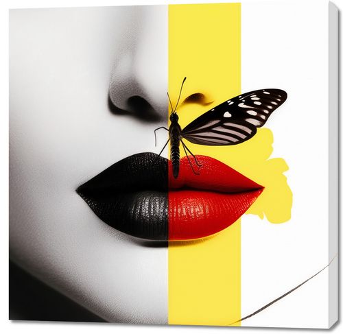 Obraz z serii abstrakcja zatytułowany Motyla Piękność. Ten obraz przedstawia twarz kobiety podzieloną na dwa kontrastujące segmenty: jeden w czerni i bieli, drugi w żywych kolorach z motylem na ustach. Ilustracja eksploruje temat dualizmu natury ludzkiej, piękna i jego zmienności. Obraz ten jest idealnym wyborem dla przestrzeni o współczesnym designie, takich jak salony piękności, studia artystyczne, a także jako wyrazisty element dekoracyjny w nowoczesnych domach.