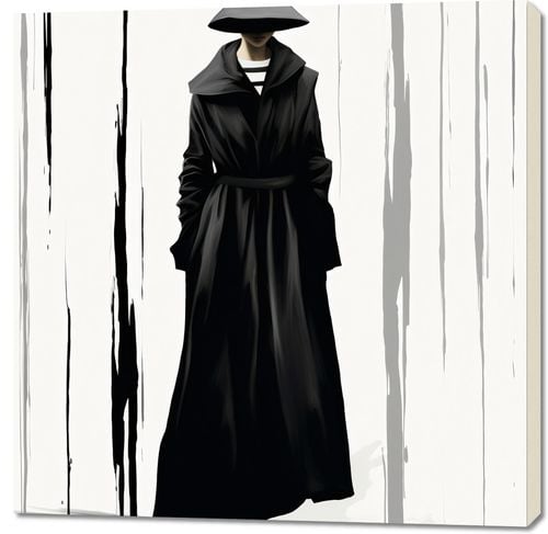 Obraz z serii wnętrza zatytułowany Mroczna Taina. Enigmatyczna postać w czarnym płaszczu i szerokim kapeluszu ukrywa swoją tożsamość, podkreślając aura tajemniczości. Czarno-białe tło z pionowymi smugami przypominającymi deszcz lub płynący atrament dodaje głębi i dramatyzmu kompozycji. Subtelne niuanse światła i cienia grają na powierzchni płaszcza, tworząc atmosferę intrygi i nieokreślonego niebezpieczeństwa. Świetnie sprawdzi się w nowoczesnych galeriach sztuki, luksusowych hotelach o minimalistycznym designie oraz w przestrzeniach przeznaczonych dla miłośników noir i kryminałów.