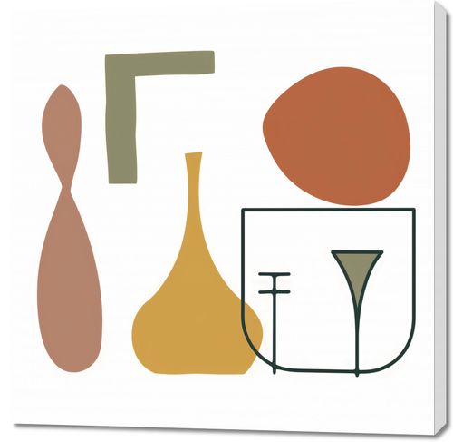 Obraz z serii boho zatytułowany Naczynia. Obraz prezentuje kolekcję abstrakcyjnych form, które przypominają różne przedmioty od naczyń po elementy dekoracyjne, tworząc estetyczną mieszankę linii i kształtów. Zestawienie spokojnych, pastelowych barw z silnymi, geometrycznymi figurami tworzy wizualnie przyjemną kompozycję, która zwraca uwagę swoją subtelną elegancją. To dzieło artystyczne jest doskonałym wyborem dla wnętrz o nowoczesnym designie, w których chcemy wprowadzić sztukę bez dominujących nad przestrzenią. Idealnie sprawdzi się jako delikatny akcent w przestronnym salonie, biurze czy jako część galerii w domowym korytarzu.