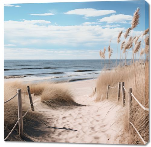 Obraz z serii pejzaże zatytułowany Nadmorski Most to tytuł tej zapierającej dech w piersiach ilustracji, która przemawia do duszy miłośnika morza. Delikatne trawy morskie tańczą w rytmie przybrzeżnego wiatru, a spokojne fale delikatnie docierają do złocistego piasku, tworząc melodię naturalnego spokoju. Nieskazitelnie błękitne niebo przechodzące w pastelowe odcienie na horyzoncie dodaje głębi i przestrzeni, tworząc obraz idealny do umieszczenia w przestrzeniach, które celebrują ciszę i kontemplację. Ten obraz będzie wyjątkowym dodatkiem do każdej plażowej chaty, salonu nadmorskiego domu, a nawet biura, przypominając o nieskończonej przestrzeni i wolności, jaką oferuje morze.