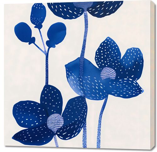 Obraz z serii wnętrza zatytułowany Nocne Kwiaty to odważne, graficzne przedstawienie kwiatów w monochromatycznej palecie kolorów granatowych. Kwiaty o stylizowanych formach i różnorodnych fakturach wyłaniają się na tle w delikatnym odcieniu, co dodaje kompozycji spokojnego, ale zarazem wyrazistego charakteru. Sploty i kropki na płatkach kwiatów tworzą iluzję głębi i tekstury, a ich symetryczny rozmieszczenie nadaje plakatowi rytmicznej harmonii. Ten obraz jest wyrafinowany i współczesny, idealny dla przestrzeni szukających minimalistycznej, ale odważnej dekoracji ściennych, takich jak nowoczesne biura, eleganckie salony czy jako wyjątkowy element w galeriach sztuki.