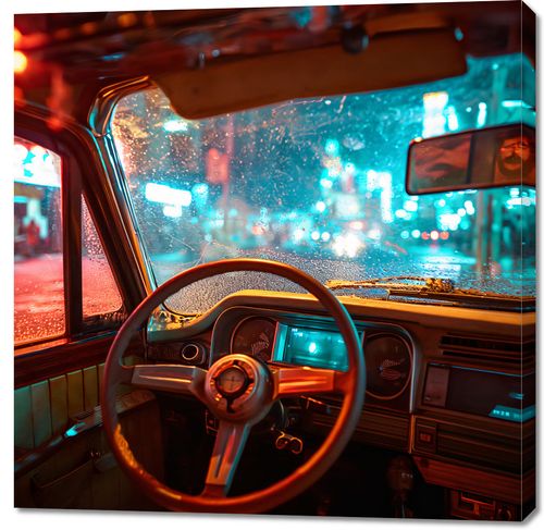 Obraz z serii pop art zatytułowany Nocny Kierowca, przedstawia widok z wnętrza klasycznego samochodu, patrząc przez deszczową, skraplaną szybę na rozświetlone neony miejskiego pejzażu nocą. Ciepłe, czerwone oświetlenie wnętrza samochodu kontrastuje z hipnotyzującym błękitem i elektrycznymi odcieniami świateł zewnętrznych, tworząc intymną, a jednocześnie dynamiczną atmosferę. Kropelki deszczu na szybie dodają tekstury i głębi, sprawiając, że scena jest zarówno realistyczna, jak i liryczna. To dzieło sztuki mogłoby znaleźć swoje miejsce w przestrzeniach nowoczesnych, miejskich loftów lub jako akcent w barze o tematyce retro, wprowadzając element tajemniczości i miejskiego romansu.
