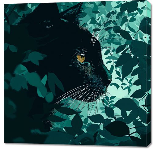 Obraz z serii wnętrza Oczekiwanie, przedstawia portret czarnego kota wtapiającego się w zielone liście. Artysta użył bogatej palety odcieni zieleni, aby stworzyć iluzję kota skrytego w gęstym listowiu, z wyraźnym, żółtym okiem, które przyciąga uwagę i daje wrażenie czujności i tajemniczości. Złożoność wzoru liści kontrastuje z prostotą cienia kota, co nadaje dziełu głębi i wielowymiarowości. Ten obraz byłby idealnym dodatkiem do każdego współczesnego wnętrza, które ceni subtelność i naturę, a także może być interesującym punktem centralnym w galerii sztuki lub przestrzeni wystawienniczej.