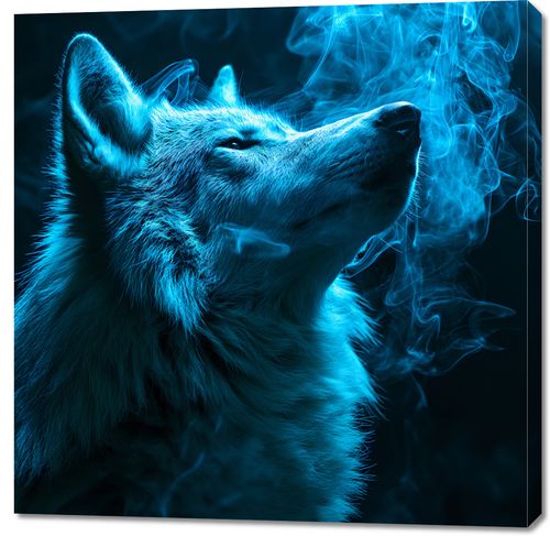 Obraz z serii natura zatytułowany Oddech Wilka przedstawia majestatycznego wilka odsłaniającego głowę ku niebu, otoczonego przez eteryczny, niebieski dym, który wydaje się być przedłużeniem jego oddechu. Sylwetka zwierzęcia jest wyraźna i dynamiczna, a jego futro jest ukazane z niesamowitą szczegółowością, każdy włos wydaje się lśnić w tajemniczym, błękitnym świetle. Dym dodaje kompozycji mistycznego klimatu, a intensywny niebieski kolor sprawia, że całość nabiera głębi i charakteru. Obraz ten doskonale sprawdziłby się jako element dekoracyjny w przestrzeniach inspirowanych naturą, takich jak domowe biblioteki, pokoje relaksu, czy studia jogi, a także jako akcent w nowoczesnych, miejskich loftach dla miłośników dzikiej przyrody i ducha wolności.