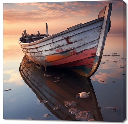 Obraz z serii pejzaże zatytułowany Odosobniona Przystań. Artystyczne zdjęcie przedstawiające opuszczoną łódź o zesztywniałych żaglach, dryfującą na spokojnych wodach przy zachodzie słońca. Odbicie łodzi w wodzie tworzy niemal doskonałe lustro, w którym łączą się niebo i morze, a zanikające kolory podkreślają upływ czasu. Złote i pastelowe odcienie zachodzącego słońca w tle nadają scenie uczucie nostalgii i spokoju. Obraz ten doskonale nadaje się do wnętrz o morskiej tematyce, takich jak nadmorskie chaty, a także jako akcent dekoracyjny w przestrzeniach, które pragną odzwierciedlić miłość do morza i żeglarstwa.