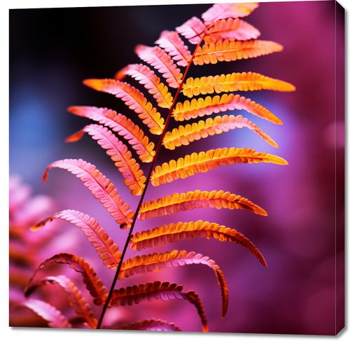 Obraz z serii natura zatytułowany Ogień Jesieni przedstawia pojedynczy liść paproci, który przechodzi przez spektrum ciepłych, jesiennych barw od żółci przez intensywną pomarańcz do głębokiego różu. Kontrastujące, żywe tło w odcieniach purpury podkreśla bogactwo i dynamikę liścia. Delikatne gradacje kolorów oraz wyraźna struktura paproci sprawiają, że obraz wydaje się niemal trójwymiarowy. Ta fotografia to idealny element dekoracyjny, który wprowadzi życie i ciepło do każdego wnętrza, nadając mu artystycznego charakteru. Doskonale sprawdzi się jako wyrazisty akcent w nowoczesnym salonie, sypialni lub biurze, szczególnie dla osób ceniących sobie naturę i jej niezwykłą paletę barw.