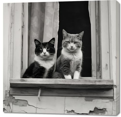 Obraz z serii wnętrza zatytułowany Para w Oknie. Uchwycenie momentu, w którym dwa koty o spokojnych i pełnych godności spojrzeniach pozują w oknie zaniedbanej fasady. Czarno-białe tło fotografii dodatkowo wzmacnia ich wyraziste, charakterystyczne wzory na sierści. Ten obraz to nie tylko urokliwa scena z życia miejskich kotów, ale również piękna metafora o spokoju i zgodzie, jaką można odnaleźć w najprostszych momentach codzienności. Obraz ten będzie wyjątkowym dodatkiem do każdego wnętrza, szczególnie polecany dla miłośników zwierząt i estetyki vintage, a także jako element ozdobny w kawiarniach czy księgarniach, który wnosi element ciepła i domowego klimatu.