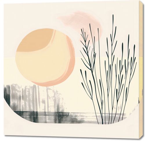 Obraz z serii boho zatytułowany Pastelowy Wschód. Obraz ukazuje subtelny, linearny rysunek roślinności na tle dużego, pastelowego słońca i delikatnie zaznaczonych elementów krajobrazu. Kompozycja w pastelowych, ciepłych barwach tworzy wrażenie spokojnego wschodu słońca, który rozświetla delikatne kontury roślin i miękkie formy w tle. Obraz ten idealnie wpasuje się do wnętrz o stonowanej kolorystyce, gdzie może dodać odrobinę ciepła i subtelnego charakteru. Doskonale nadaje się do sypialni, salonów, czy innych miejsc odpoczynku, gdzie wprowadzi łagodny nastrój i poczucie wyciszenia.