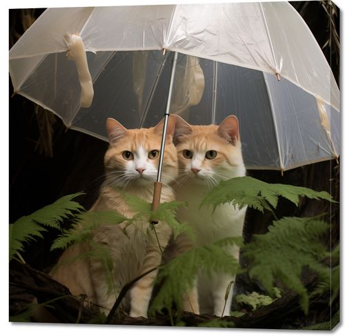 Obraz z serii wnętrza zatytułowany Podwójna Ochrona przedstawia dwie urocze, rude koty szukające schronienia pod przezroczystym parasolem, który zdaje się być koroną zielonej paproci. Ich symetryczne odbicie w połyskliwej strukturze parasola dodaje głębi i charakteru kompozycji. Ciepłe odcienie futra kotów kontrastują z ciemnym, zielonym tłem, co sprawia, że stają się centralnym punktem obrazu. Ich spojrzenia są skierowane prosto w obiektyw, co nadaje fotografii osobisty i intymny charakter. To zdjęcie idealnie uchwyciło moment spokoju i ochrony w naturalnym otoczeniu, a zarazem subtelnie podkreśla więź między dwoma zwierzętami. Idealne do wnętrz o domowym, ciepłym charakterze, zarówno dla miłośników kotów, jak i miłośników przyrody.