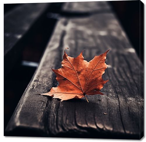 Obraz z serii natura zatytułowany Pojedynczy Liść. Ten obraz przedstawia pojedynczy, jasnobrązowy liść klonu, spoczywający na ciemnym, drewnianym tle ławki parkowej. Głębokie, nasycone kolory i wyraźny kontrast między liściem a ciemnym tłem, wywołują uczucie intymności i refleksji. Idealny dla przestrzeni, które chcą oddać hołd zmienności sezonów i subtelnemu pięknu natury, ten plakat wprowadza ciepło i spokój do każdego domu, biura, czy miejsca publicznego, zachęcając do chwili zadumy i spokoju.