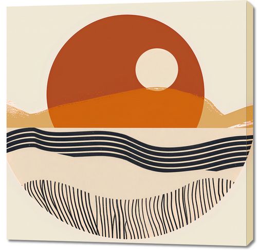 Obraz z serii boho zatytułowany Pół na Całość. Obraz przedstawia uproszczony, geometryczny krajobraz, w którym słońce jest głównym bohaterem, stanowiąc centralny punkt kompozycji. Jego okrągły kształt dominuje na tle abstrakcyjnych wzgórz i falujących linii, które mogą przypominać wzburzone morze lub piaszczyste wydmy. Kolorystyka plakatu to spokojna paleta ciepłych odcieni pomarańczu, beżu i czerni, która nadaje dziełu głębi i kontrastu.Ten obraz będzie wspaniałym dodatkiem do wnętrz urządzonych w ciepłych, ziemistych barwach, gdzie może dodać nowoczesnego charakteru. Idealnie sprawdzi się jako punkt centralny w przestrzeniach, które korzystają z naturalnego światła, takich jak salony, gabinety czy przestronne hole.