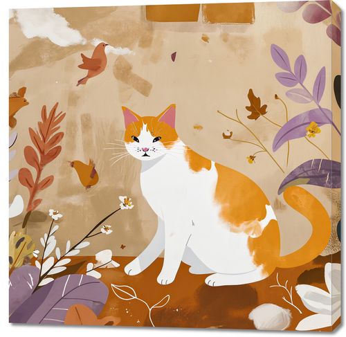 Obraz z serii abstrakcja zatytułowany Pospolita Krasa. Prezentuje on biało-rudego kota o bystrym spojrzeniu, wtapiającego się w pastelowy krajobraz pełen delikatnych kwiatów i latających ptaków. Jego łagodna postawa i miękkość linii kontrastują z żywiołowym tłem, dodając mu charakteru i głębi. Scena ta sprawdzi się w przestrzeniach, gdzie chcemy dodać odrobiny spokoju i natury, jak salony, pokoje relaksu, a także jako element dekoracyjny w klinikach weterynaryjnych lub sklepach zoologicznych, podkreślając bliskość ze światem zwierząt.