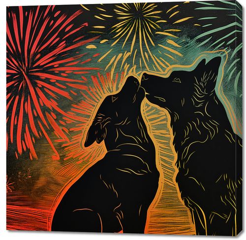 Obraz z serii abstrakcja zatytułowany Psi Uścisk. Przedstawia on dwie sylwetki psów, które wydają się być zwrócone ku sobie w gest podobny do uścisku, na tle intensywnie kolorowego nieba z fajerwerkami. Barwy od czerwieni po żółcie i zielenie tworzą tło, które wygląda jak nocne niebo w trakcie świętowania. Styl graficzny jest dynamiczny i pełen energii, a linie tworzące sylwetki psów są płynne i wyraziste. Ten obraz wyraża radość i nieodłączną więź pomiędzy zwierzętami, będąc doskonałym dodatkiem do wnętrz, gdzie chcemy podkreślić ciepło i pozytywne emocje.