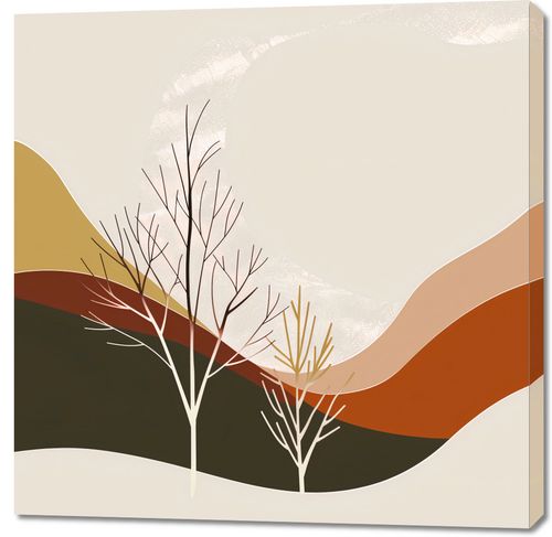 Obraz z serii minimalistyczne zatytułowany Pustynia Widzi. Obraz ukazuje dwie subtelne, ogołocone z liści drzewa, które wyłaniają się z miękkich, falujących form pustynnych wydm. Barwy są stonowane, z dominującymi odcieniami brązu, beżu i terakoty, co oddaje ciepłą i suchą atmosferę pustyni. Tło zawiera tekstury, które mogą przypominać piasek lub delikatną gęstwinę. Ten obraz doskonale sprawdzi się jako dodatek do wnętrz w stylu natur, dodając im ziemiściej palety i przywołując poczucie spokoju oraz prostoty. Będzie się dobrze komponować w przestrzeniach takich jak salon, pokój relaksu, a nawet biuro, wprowadzając elementy spokojnego krajobrazu, które mogą inspirować i uspokajać.