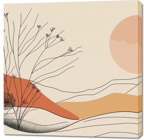 Obraz z serii boho zatytułowany Pustynna Wydma. Obraz ukazuje krajobraz z delikatnie zarysowanymi roślinami na tle łagodnych, pustynnych wydm. Spokojna kolorystyka, opierająca się na miękkich odcieniach beżu, pomarańczy i czerwieni, oddaje kojący klimat zmierzchu. W tle widoczne jest wielkie, ciepłe słońce, które rzuca złoty blask na całą scenę, nadając jej harmonijny charakter. Ten obraz będzie piękną dekoracją do wnętrz, które pragną wprowadzić elementy natury w połączeniu z minimalistycznym designem. Jego uspokajające barwy i proste linie idealnie wpasują się w przestrzenie takie jak sypialnie, salony, miejsca odpoczynku, czy nawet biura kreatywne, pragnące wykreować przestrzeń sprzyjającą relaksowi i inspiracji.