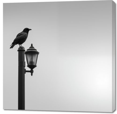 Obraz z serii wnętrza zatytułowany Samotny Postój Kruka. Prezentuje on sylwetkę kruka spoczywającego na klasycznej latarni ulicznej, uchwyconą w monochromatycznej palecie szarości. Ten spokojny, lecz sugestywny obraz jest symbolem refleksji i tajemnicy, doskonale wpisując się w klimat współczesnych przestrzeni miejskich. Praca ta z pewnością stanie się wyrazistym dodatkiem do nowoczesnych wnętrz, takich jak lofty czy minimalistyczne salony, a także wniesie element zastanowienia do przestrzeni publicznych takich jak galerie, kawiarnie i biblioteki, gdzie odosobnienie miesza się z miejskim zgiełkiem.