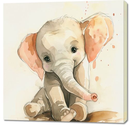 Obraz z serii wnętrza zatytułowany Siwy Słonik to czarująca akwarela przedstawiająca małego, siwego słonia z dużymi, wyrazistymi oczami i rozłożystymi uszami w odcieniach różu. Delikatność i ciepło ilustracji wydobywają ujmującą niewinność młodego słonia. Rozpryski akwareli wokół postaci dodają dynamiki i lekkości, sugerując radosną zabawę i beztroskę. Ten obraz wprowadza atmosferę spokoju i radości, idealnie nadają się do ozdobienia przestrzeni dziecięcej, takiej jak pokoje maluchów, przedszkola, sale zabaw czy kąciki czytelnicze w bibliotekach. Jego urokliwy obraz może inspirować młode umysły do marzeń i pozytywnego myślenia.