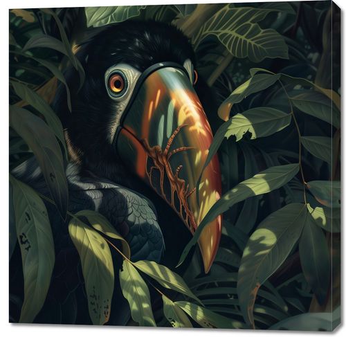 Obraz z serii natura zatytułowany Skryty Tukan przedstawia zaskakujący i intensywny portret tukana, zanurzonego w gęstej, tropikalnej zieleni. Ptak ma swoje charakterystyczne, kolorowe dziob w odcieniach pomarańczy i czerni, który odbija światło, tworząc efekt lustrzanego odbicia. Jego przenikliwe oko, obserwujące widza, dodaje głębi i charakteru kompozycji. Otaczające go rośliny są pełne detali, z subtelnymi gradiencjami kolorów i światłocieni, co tworzy efekt trójwymiarowości i ukrycia. Ta ilustracja emanuje tajemnicą tropikalnego lasu, gdzie natura i dzikie zwierzęta współistnieją w delikatnej równowadze. Obraz ten jest idealny dla przestrzeni, które cenią sobie piękno natury i chcą wprowadzić element dzikiej, nieujarzmionej przyrody do swojego otoczenia.