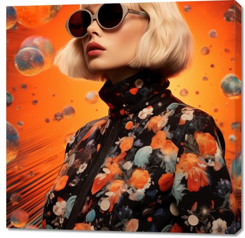 Obraz z serii pop art zatytułowany Słoneczny Akcent. Ten ekscytujący obraz łączy w sobie klasykę mody z elementami astrologii, prezentując postać kobiety w eleganckich okularach przeciwsłonecznych i kurtce w kwiatowy wzór. Tło w intensywnych odcieniach pomarańczy i czerwieni, z graficznymi przedstawieniami planet, nadaje kompozycji kosmiczną atmosferę. Modny bob i minimalistyczne okulary stanowią nowoczesny akcent, który w połączeniu z odważnym tłem tworzy wyjątkową wizję. Obraz jest idealny dla przestrzeni, które pragną wprowadzić modną, a jednocześnie kosmiczną atmosferę – doskonały do nowatorskich salonów, pracowni mody lub jako wyrazisty element dekoracyjny w prywatnych domach miłośników designu.