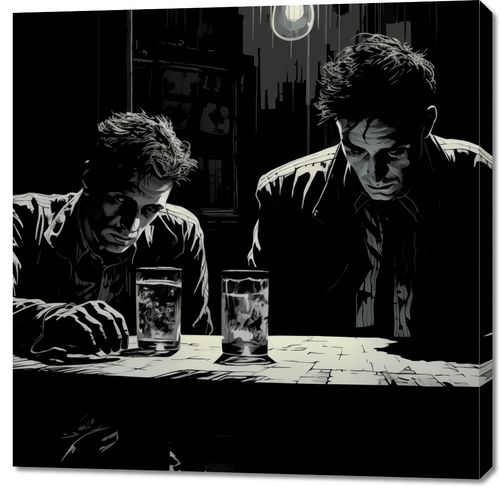 Obraz z serii abstrakcja zatytułowany Spiskowcy. Ta grafika przedstawia dwóch mężczyzn zanurzonych w głębokiej konwersacji przy barowym stole. Stylizacja na czarno-biało uchwyciła napięte, dramatyczne oświetlenie i cienie, które nadają scenie klimat tajemniczości i suspensu. Wyraźne kontury i kontrastowe światłocienie podkreślają wyraziste postaci mężczyzn i ich zacięte postawy. Obraz ten przemawia do miłośników klasycznego kina i literatury, doskonale nadając się do dekoracji przestrzeni o męskim charakterze, takich jak prywatne gabinety, domowe bary czy miejsca spotkań.