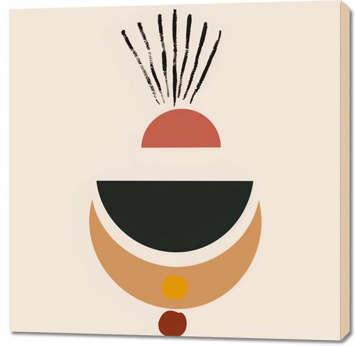 Obraz z serii boho zatytułowany Spójna Refleksja.Grafika ukazuje abstrakcyjną kompozycję geometrycznych kształtów w spójnej, ciepłej palecie barw, sugerującą delikatność i równowagę. Cechą charakterystyczną są wydłużone, smukłe linie wychodzące z półkola na górze, które mogą przypominać promienie słońca czy roślinne motywy. Ten obraz doskonale wpasuje się w nowoczesne i minimalistyczne przestrzenie, takie jak jadalnie, salony, a nawet kreatywne przestrzenie pracy, gdzie może stanowić spokojny punkt skupienia i inspirować do przemyśleń.