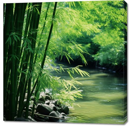Obraz z serii natura zatytułowany Spokój Bambusów. Ukazuje on idylliczny zakątek przyrody, gdzie zielone pędy bambusa delikatnie zginają się nad błogim, spokojnie płynącym strumieniem. Gra światła i cienia na liściach bambusa tworzy wrażenie głębi i spokoju, zaś szemrząca woda dodaje uczucie świeżości i czystości. Ten obraz oddaje piękno i spokój odosobnionego zakątka natury, jest więc idealny dla przestrzeni relaksacyjnych takich jak spa, pokoje do medytacji lub jako ukojenie w zgiełku codzienności w domowych wnętrzach. To doskonała dekoracja dla tych, którzy pragną wprowadzić element natury i harmonii do swojego otoczenia.