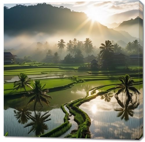 Obraz z serii pejzaże zatytułowany Świt nad Tarasami. Ta zachwycająca scena przedstawia malownicze tarasy ryżowe, kąpane w ciepłym świetle wschodzącego słońca. Mgła delikatnie opada na zielone pola, a w tle majaczą zarysy gór, dodając głębi i tajemniczości krajobrazowi. Palmy i tradycyjne chaty dopełniają obrazu, tworząc wizję spokoju i harmonii z naturą. Obraz emanuje spokojem i jest hołdem dla prostoty wiejskiego życia. Idealnie wkomponuje się w przestrzenie, gdzie chcemy wprowadzić element uspokajający i zainspirowany naturą, jak medytacyjne spa, poczekalnie w klinikach wellness czy prywatne biblioteki.
