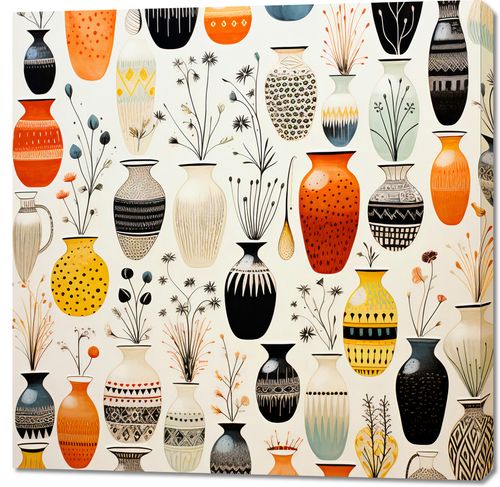 Obraz z serii wnętrza zatytułowany Symfonia Wazonów. Wspaniałe wazony w bogatej palecie kolorów, od głębokiej czerni do ciepłych odcieni pomarańczu, tworzą intrygującą mozaikę wzorów i kształtów. Delikatne motywy roślinne, które zdobią niektóre wazony, dodają uroku i lekkości, a różnorodność wzorów i faktur przyciąga wzrok i zaprasza do głębszej refleksji. Kontrast między jasnymi i ciemnymi barwami, a także subtelne niuanse w każdym wazonie, dodają tej kompozycji głębi i dramatu. Ten artystyczny plakat doskonale wpisuje się w klimat wyrafinowanych galerii sztuki, eleganckich kawiarni oraz nowoczesnych przestrzeni mieszkalnych, które stawiają na unikatowy design.