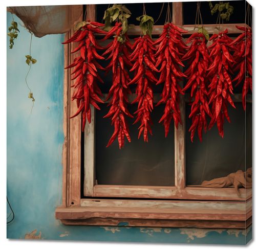 Plakat z serii wnętrza zatytułowany Szczypta Chilli - malowniczy obraz pełen kulturowego bogactwa, przedstawiający bujne kiście czerwonych papryczek chili, suszące się na drewnianej ramie okna. Kontrastujące kolory - żywe czerwienie chili na tle pastelowo-niebieskiej ściany - przyciągają wzrok i oddają esencję wiejskiego życia. Przytulne okno i zardzewiała siatka nadają scenie autentyczny, wiejski charakter, a delikatne odcienie i tekstury ściany dodają głębi i ciepła. Obraz ten jest hołdem dla prostoty i naturalnego piękna codziennego życia, idealnym do wnętrz, które pragną wnieść element tradycyjnego rzemiosła i natury.