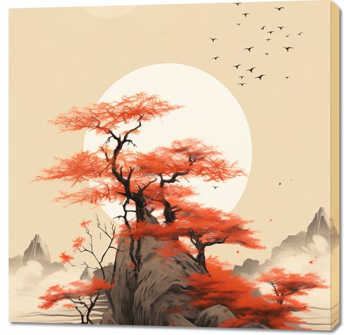 Obraz z serii pejzaże zatytułowany Szepty Wiatru. Niesamowity krajobraz z jaskrawo czerwonymi drzewami rosnącymi na majestatycznej skale, której kształty wydają się być ukształtowane przez wieki. Błyszczący biały księżyc oświetla spokojne wody, które otaczają skale, podczas gdy stado ptaków przenika przez jasne niebo, dodając uczucie przestrzeni i nieskończoności. Subtelne odcienie szarości i biele w tle tworzą kontrast dla wyrazistych czerwieni drzew, nadając scenie głębię i dramatyzm. Idealny do ozdoby salonów medytacyjnych, gabinetów terapeutycznych lub luksusowych hotelowych holów.
