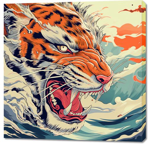 Obraz z serii motywy wschodnie zatytułowany Tygrys Na Fali. Ilustracja przedstawia potężnego tygrysa wyłaniającego się z wzburzonych fal oceanu, z paszczą szeroko otwartą w głośnym ryku. Styl graficzny, z wyrazistymi liniami i żywymi kolorami, przypomina klasyczne azjatyckie sztuki, łącząc w sobie elementy tradycji i nowoczesności. Dynamiczne pociągnięcia pędzlem i kontrastowe kolory podkreślają siłę i dzikość sceny. Obraz ten będzie idealnym akcentem w przestrzeniach, które celebrują energię i życiową siłę, takich jak sale do ćwiczeń, studia artystyczne czy nowoczesne biura.