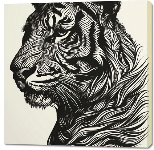 Obraz z serii wnętrza zatytułowany Tygrysi Gwizd. Ta dramatyczna grafika przedstawia tygrysa w stylu linorytu, z wyraźnymi, płynnymi liniami układającymi się w złożony wzór futra. Monochromatyczna paleta, z ciemnymi i jasnymi odcieniami na neutralnym tle, podkreśla majestatyczną postawę i intensywny wzrok tego dzikiego zwierzęcia. Obraz emanuje siłą i elegancją, oddając w pełni królewski charakter tygrysa. Idealny do wnętrz urządzonych w stylu minimalistycznym lub nowoczesnym, będzie także pasował do przestrzeni, które chcą podkreślić motywy przyrodnicze lub eksplorować tematykę ochrony dzikiej przyrody.