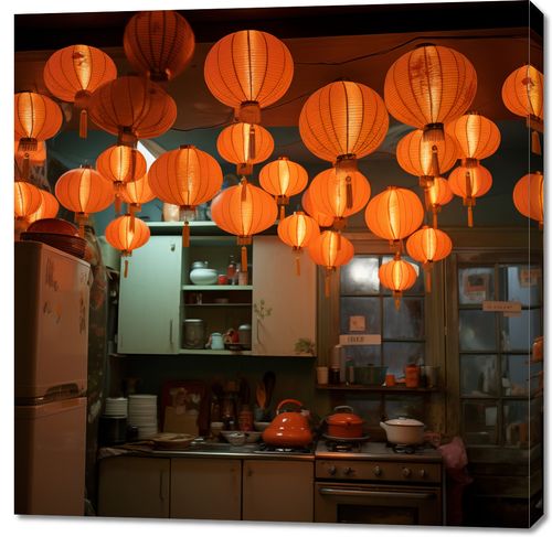 Obraz z serii motywy wschodnie zatytułowany W Blasku Lampionów. Ten przytulny obraz przedstawia sznur ciepłych, pomarańczowych lampionów zawieszonych w przestrzeni kuchni, które oświetlają wnętrze domowym ciepłem. Lampiony, w tradycyjnym azjatyckim stylu, z ciepłym światłem, nadają pomieszczeniu uczucie gościnności i spokoju. Przywołując na myśl spokojne wieczory, ten obraz idealnie wpasuje się w wnętrza inspirowane dalekowschodnią estetyką oraz w każde miejsce, gdzie chcemy dodać odrobinę orientalnego uroku. Świetnie sprawdzi się w kuchniach, salonach, a także w przestrzeniach komercyjnych takich jak restauracje serwujące azjatycką kuchnię czy teahouse'y.