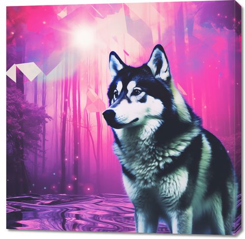 Obraz z serii pop art zatytułowany Wilczy Duch. Ta hipnotyzująca grafika łączy w sobie realistyczny wizerunek wilka z eterycznym, neonowym lasem w tle, co nadaje scenie onirycznego, mistycznego charakteru. Wilk, przedstawiony w pełnym majestacie, stoi na brzegu zaczarowanego jeziora, a tajemnicze, geometryczne kształty unoszą się w powietrzu, dodając kompozycji elementu fantastyki. Wyraziste kolory różu i fioletu tworzą niemal bajkową atmosferę. Obraz jest idealnym wyborem dla miłośników natury i jej mistycznych aspektów, świetnie nadaje się do wnętrz o tematyce przyrodniczej, pokojów dla młodzieży, lub jako unikatowy element dekoracyjny w przestrzeniach współczesnych.
