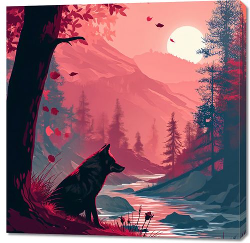 Obraz z serii abstrakcja zatytułowany Wilk Przy Brzegu Lasu przedstawia urzekającą scenę, w której wilk stoi na brzegu lasu, wpatrując się w odległy zachód słońca. Idylliczny krajobraz ukazuje rzekę wijącą się między drzewami, a w tle majestatyczne góry przybierające ciepłe odcienie zachodzącego słońca. Niebo w odcieniach różu i pomarańczy odbija się w spokojnych wodach rzeki, tworząc lustrzane odbicie, które dodaje głębi kompozycji. Spadające liście z drzew o ciepłych, jesienno-czerwonych barwach, wirują wokół wilka, dodając dynamiki i uczucia zmienności pór roku. Ten plakat idealnie wpasuje się w wnętrza o tematyce natury i dzikiej przyrody, takie jak pokoje o tematyce przyrodniczej, przestrzenie wypoczynkowe, a także jako inspirujący element dekoracyjny w biurach i domowych gabinetach, przypominając o sielskich i spokojnych aspektach życia.