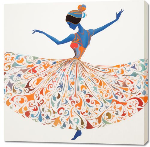 Obraz z serii abstrakcja zatytułowany Wirująca Balerina. Obraz przedstawia tancerkę w barwnym, rozłożystym stroju, który tworzy efekt wirującej sukni. Tancerka jest przedstawiona w dynamicznej pozie tanecznej, z rękami delikatnie uniesionymi. Suknia jest zdobiona bogatym, ornamentowym wzorem w ciepłych odcieniach pomarańczy, czerwieni, niebieskiego i kremu, które nadają jej lekkości i elegancji. Stylizacja postaci i wzory na sukni mogą nawiązywać do tradycyjnych strojów tanecznych lub folklorystycznych, a cała kompozycja przypomina sztukę w stylu Art Nouveau. Obraz ten wprowadza atmosferę radości i świętowania, doskonale nadając się do przestrzeni kulturalnych, sal tanecznych, teatrów lub jako wyrafinowana dekoracja w domowych wnętrzach.
