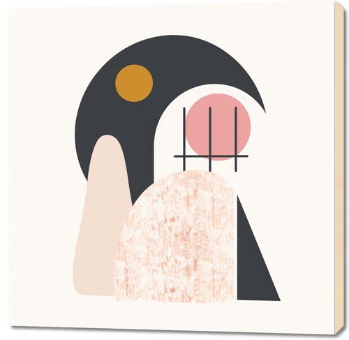 Obraz z serii boho zatytułowany Zakres Widoku.Obraz przedstawia abstrakcyjną kompozycję łączącą kształty zakrzywione i geometryczne, wykorzystującą miękką i spójną paletę kolorów. Dominujące kolory to czarny, odcienie różu, beż oraz akcent żółtego, tworząc poczucie równowagi i nowoczesnej estetyki. Kompozycja składa się z nakładających się form, w tym dużej czarnej figury z wycięciem koła, przez które prześwituje część różowego koła, oraz żółtego koła umieszczonego w obszarze czarnym, co może sugerować ciało niebieskie typu księżyc lub słońce. Obecne są również elementy fakturalne, dodające głębi i intrygi jednemu z kształtów, a proste linie przecinają różowe koło, przyczyniając się do wizualnego zainteresowania dziełem. Całość kompozycji przekazuje spokojne i współczesne wrażenie, prawdopodobnie czerpiąc inspirację z natury i sztuki abstrakcyjnej.