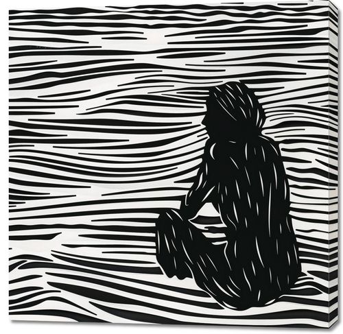 Obraz z serii abstrakcja zatytułowany Złożone Fluidalne Linie. Plakat przedstawia abstrakcyjną, czarno-białą ilustrację, w której kontrastowe, fluidalne linie tworzą efekt wzburzonej powierzchni wody. Na tej dynamicznie zarysowanej powierzchni wyłania się sylwetka osoby, która siedzi w skupieniu, z głową zwróconą w stronę obserwatora. Postać jest zredukowana do ciemnych, monochromatycznych bloków, co nadaje jej minimalistyczny, ale wyrazisty charakter. Sylwetka człowieka jest wyraźnie zarysowana i stanowi centralny punkt kompozycji, a jej kontury płynnie wtapiają się w abstrakcyjne tło. Ten artystyczny obraz łączy prostotę z głębią, sugerując kontemplację lub introspekcję. Jego prosta paleta barw i silne linie mogą przyciągać uwagę i inspirować do refleksji nad spokojem i złożonością ludzkiej natury.