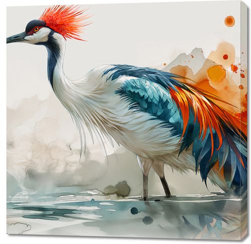 Obraz z serii abstrakcja zatytułowany Żuraw w Akwareli. Przedstawia on artystyczną, akwarelową interpretację eleganckiego ptaka stojącego w wodzie. Żuraw ma wyrazisty czerwony czub, który jest kontrastujący z delikatnymi błękitami i pomarańczami jego piór. Tło obrazu jest lekkie i spokojne, z abstrakcyjnymi plamami kolorów, które mogą przypominać rozmyty krajobraz lub odbicie w wodzie. Całość kompozycji łączy naturalne piękno z elementami abstrakcji, co nadaje jej nowoczesnego charakteru. Obraz ten będzie idealny do wnętrz, które cenią sobie harmonię i spokój, jak salony SPA, jadalnie, czy pokoje relaksacyjne. Może także stanowić subtelne, ale wyraziste dopełnienie w nowoczesnym biurze lub domowym salonie, przynosząc element natury i sztuki do codziennego otoczenia.