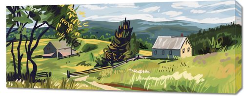 Obraz z serii pejzaże zatytułowany Bujna Wieś. Plakat przedstawia malowniczą scenę z wiejskiego krajobrazu, gdzie dominuje pastelowa paleta barw. W centralnym punkcie obrazu widzimy prostą, białą chłopską chatę z szarym dachem, otoczoną przez bujną, zieloną roślinność i rozległe pola. Drzewa z żółtymi akcentami wskazują na wczesną jesień, a ich rozmieszczenie i forma dają wrażenie naturalnego, rustykalnego otoczenia. Jasne, dynamiczne pociągnięcia pędzlem na niebie nadają scenie lekkości i ruchu, podczas gdy delikatnie zaznaczone wzgórza w tle oferują poczucie głębi i przestrzeni. Kolorystyka obrazu, łącząca ciepłe odcienie żółci z chłodnymi błękitami, przyciąga oko i sprawia, że scena jest zarówno spokojna, jak i energetyczna. Ta ilustracja może przywoływać uczucia nostalgii i spokoju, a także zachęcać do refleksji nad pięknem prostego życia na wsi.